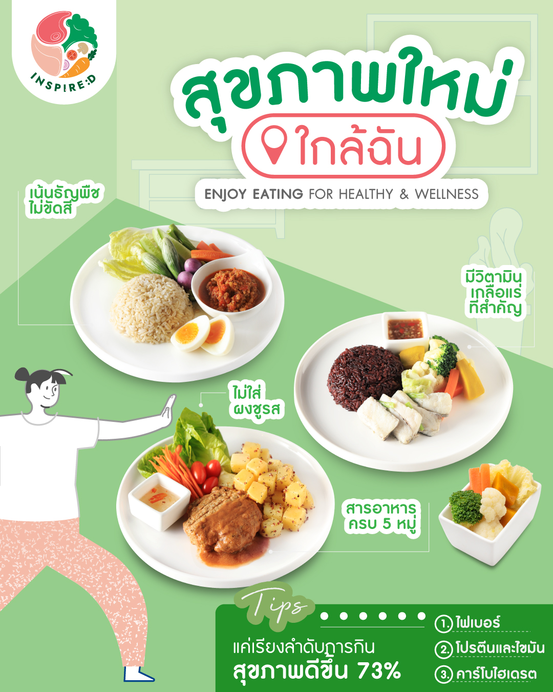 Inspired ร้านอาหารเพื่อคนรักสุขภาพ มีสารอาหารครบ 5 หมู่ เน้นธัญพืชไม่ขัดสี ได้วิตามินเกลือแร่ที่สำคัญ ไม่ใส่ผงชูรส มั่นใจ ปลอดภัย ปลอดสาร แน่นอน
